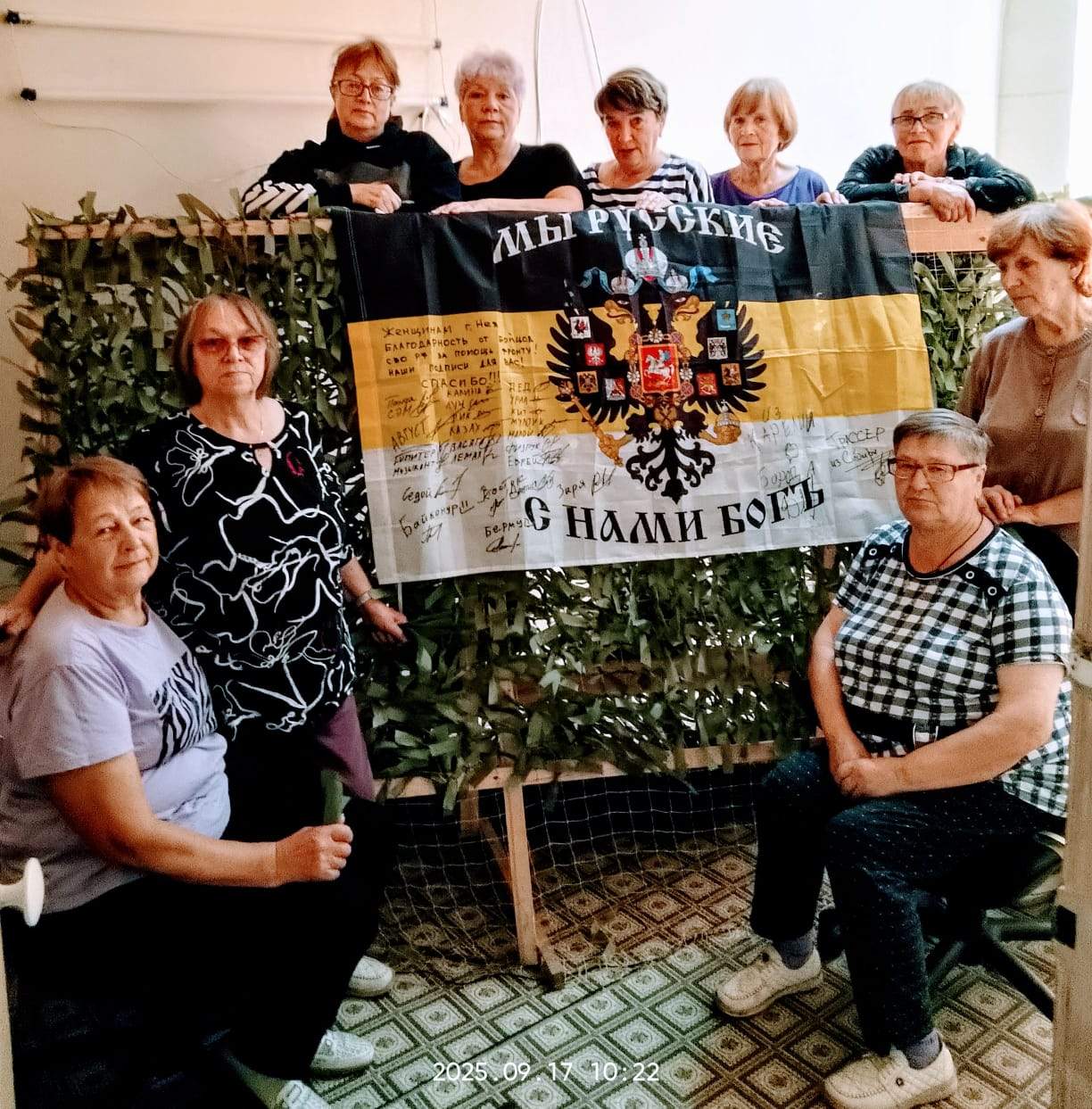 Наши ребята передали в дар свой флаг «Мы русские! С нами бог!» На стяге написали «Женщины г. Нея! Благодарность от бойцов СВО РФ за помощь фронту. Наши подписи для вас» и расписались.